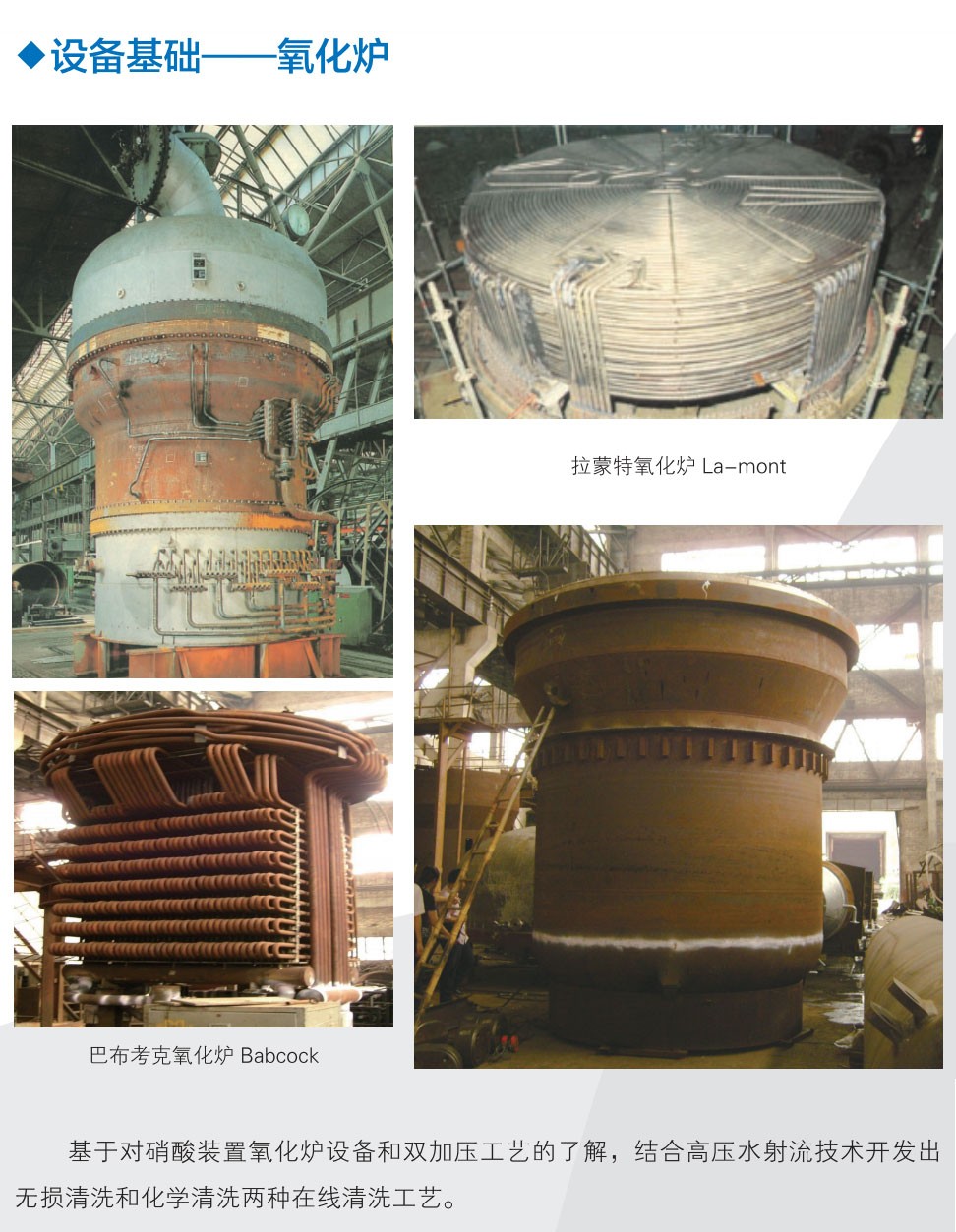 双加压硝酸装置采用的巴布考克(babcock)和拉蒙特(La-mont)锅炉,设备结构较复杂,不能采用简单机械清洗,只有通过整体在线清洗才能达到提高换热效率的目的。